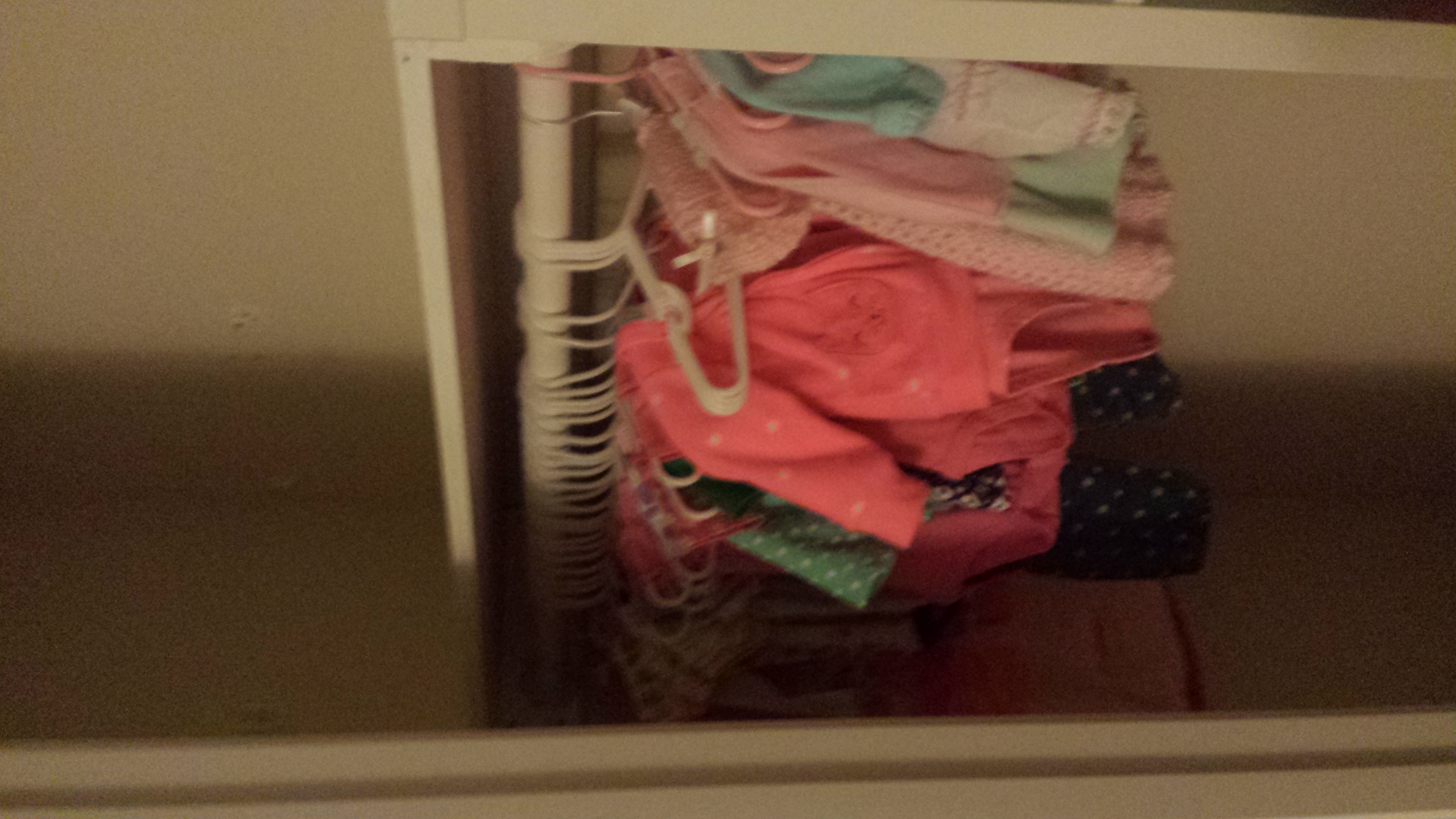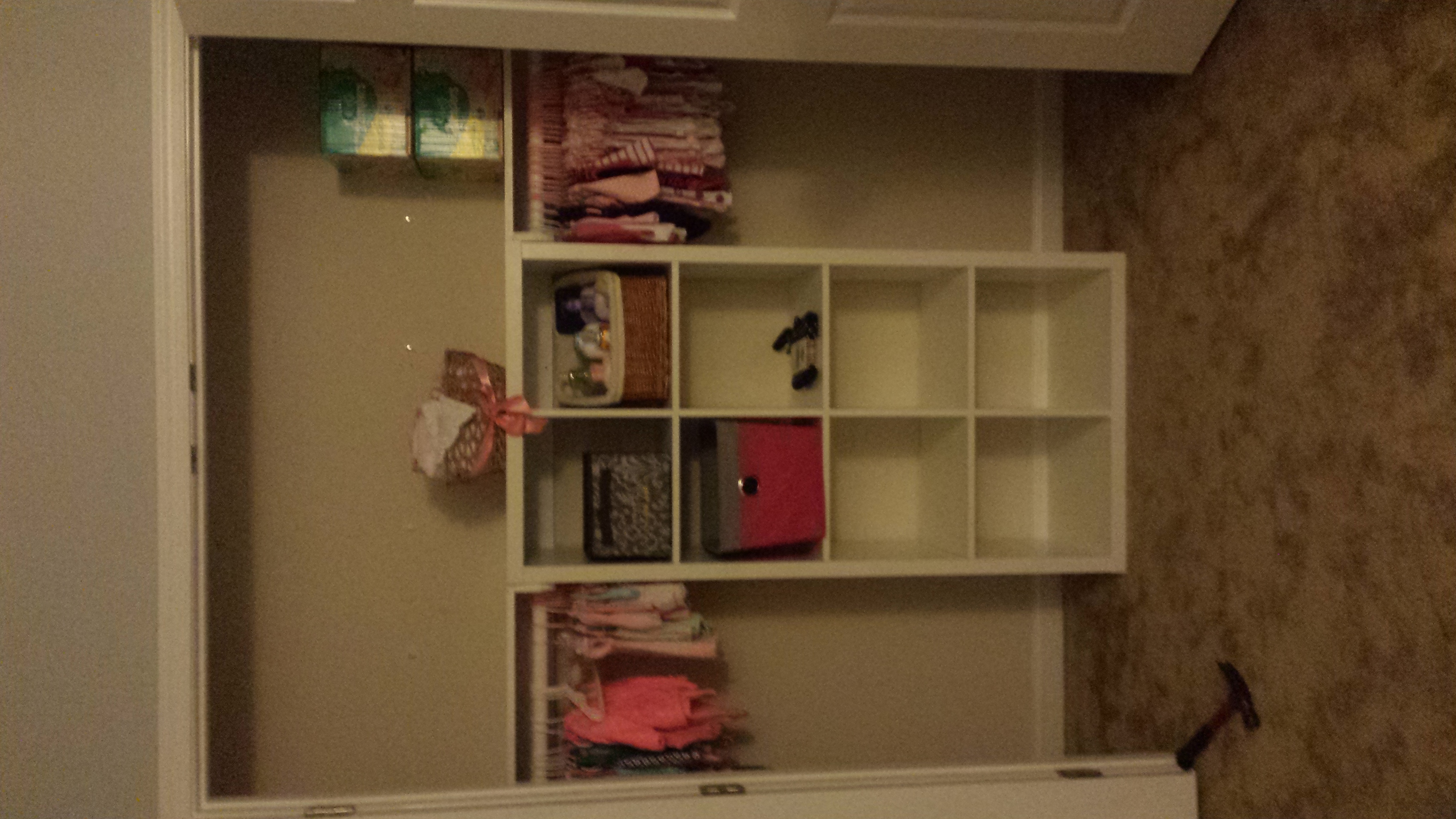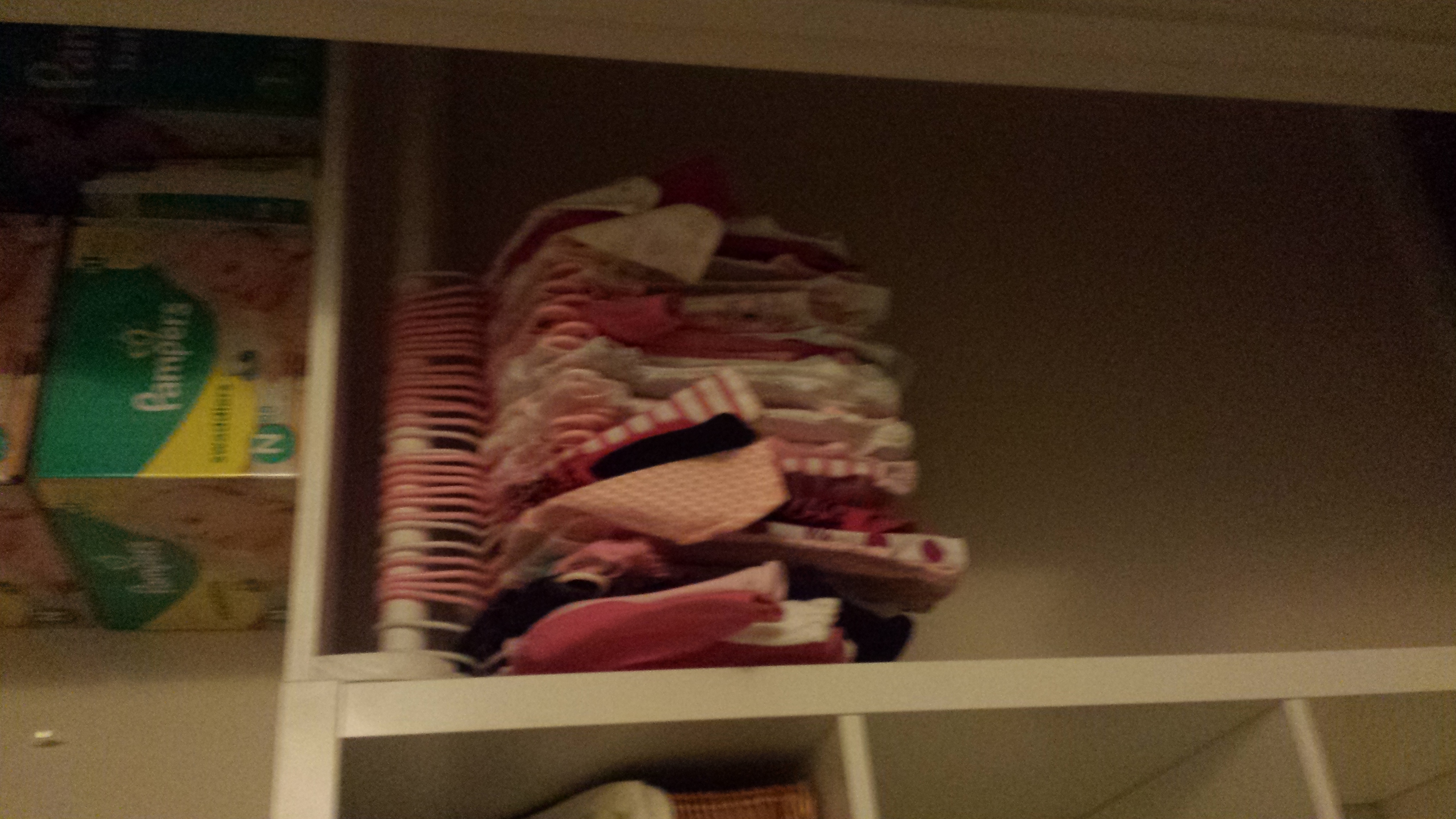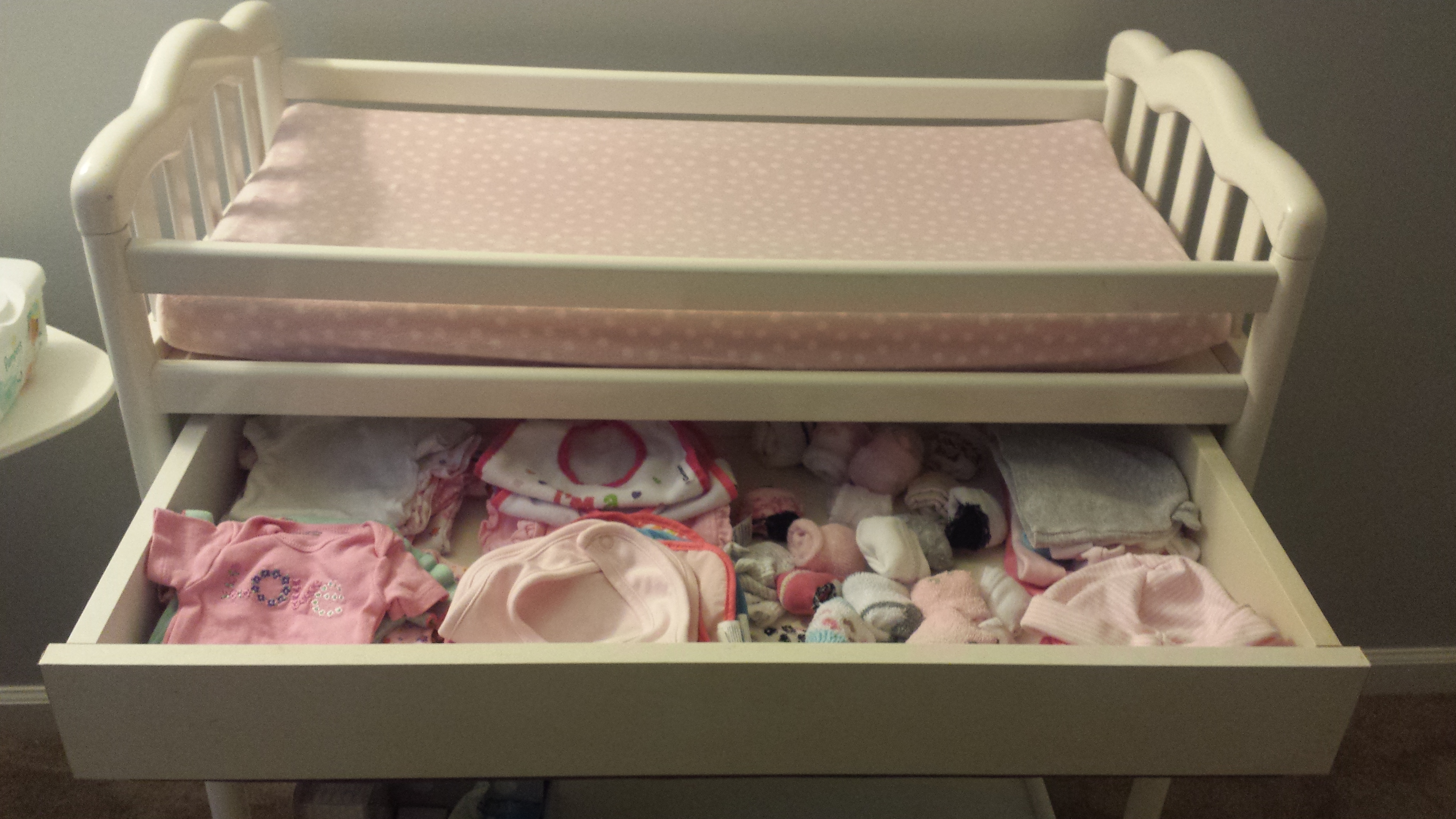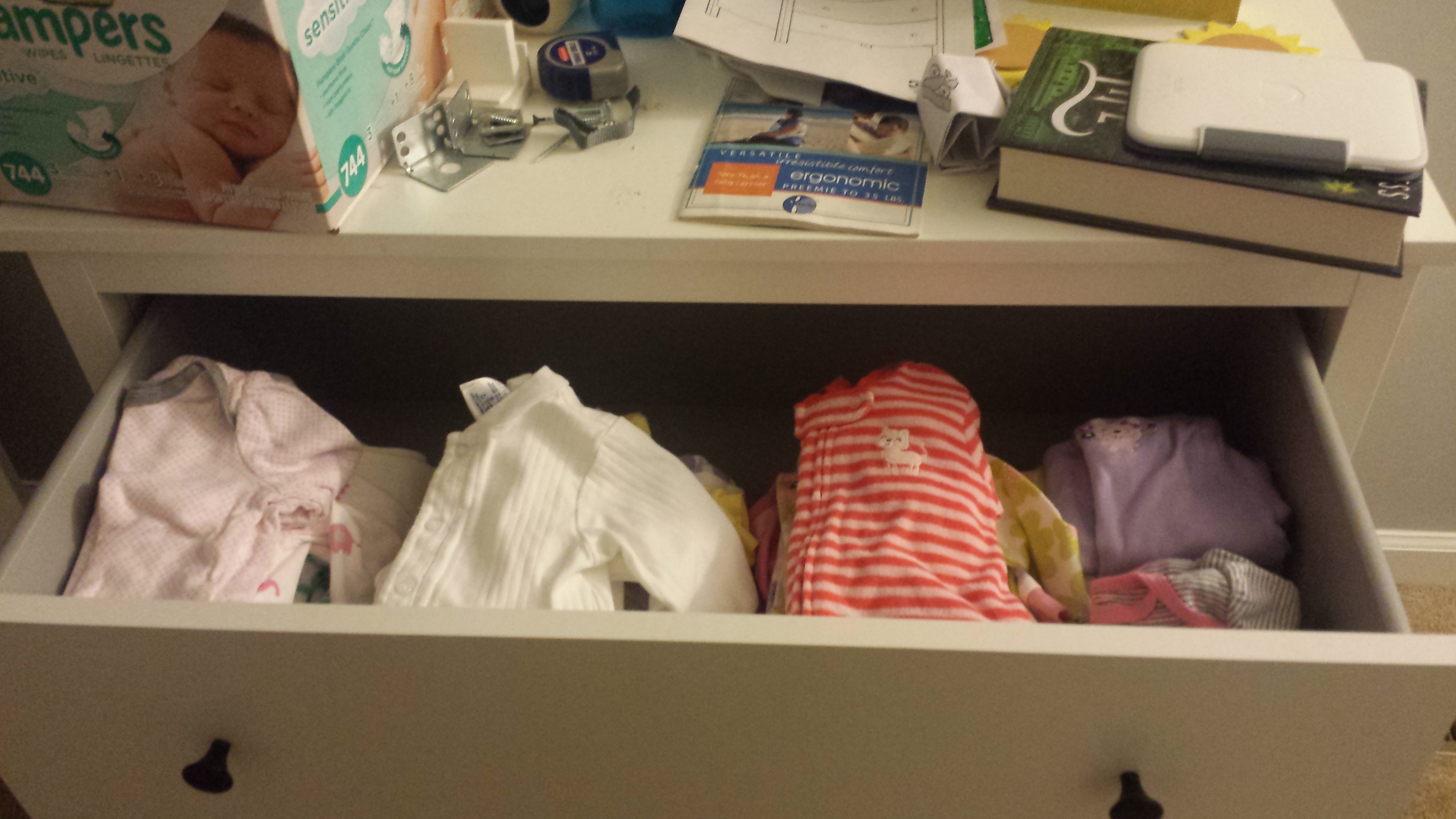 Dad is awesome! The middle is ikea shelves and dad built around it. I'm so excited for it! Right side is 0-3 mons, left is some newborn cardigans and the rest are 3-6. Then we have newborn onsies in the changing table, with bibs, socks and hats. Then the drawer has her sleepers, pants and leggings.