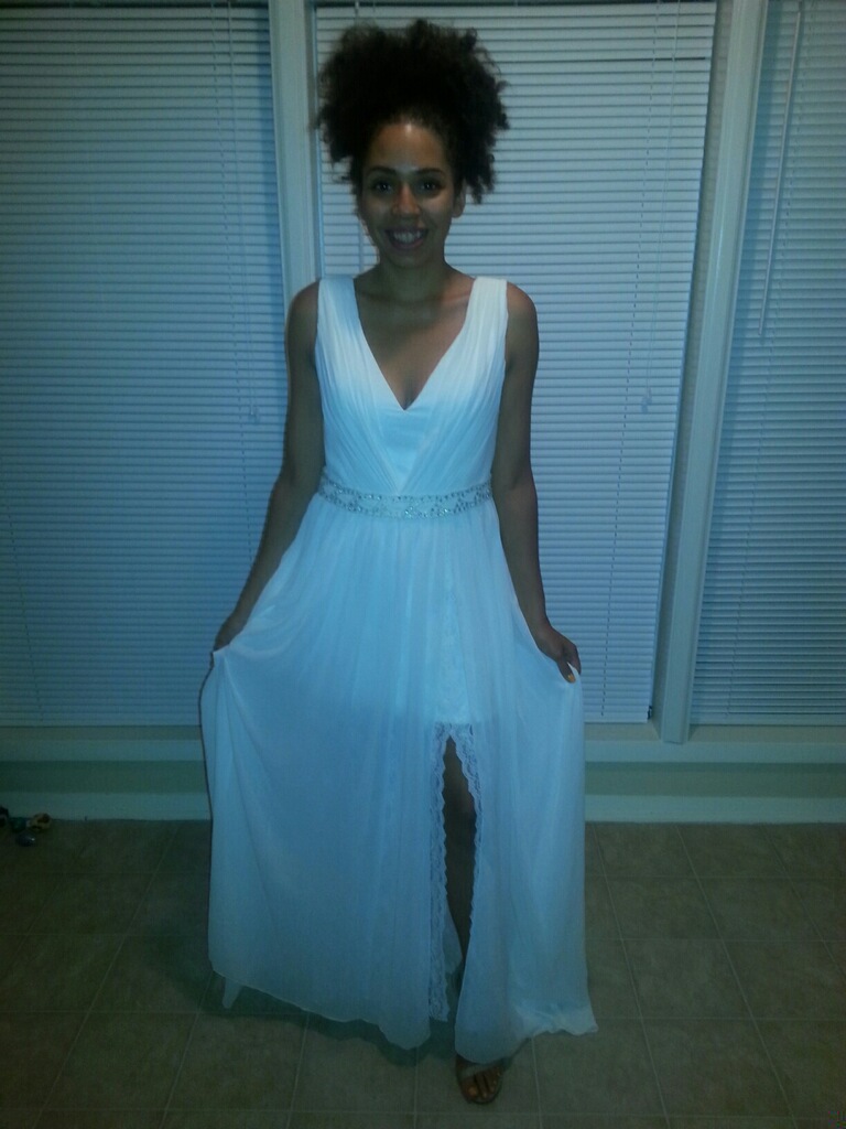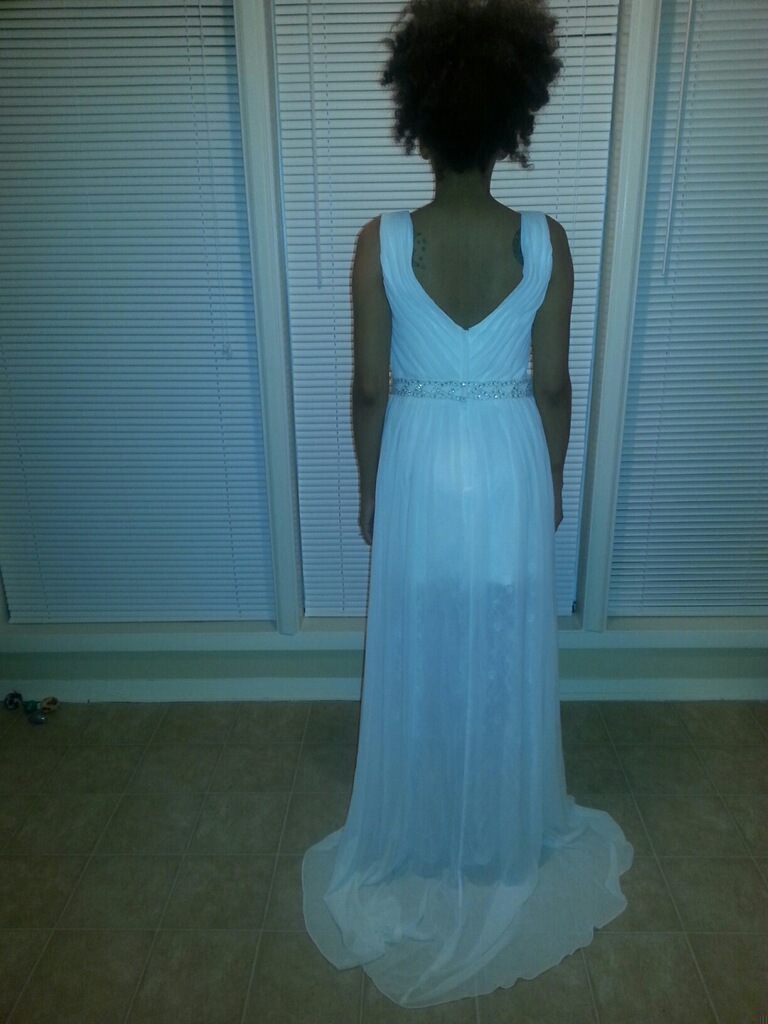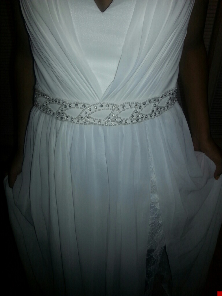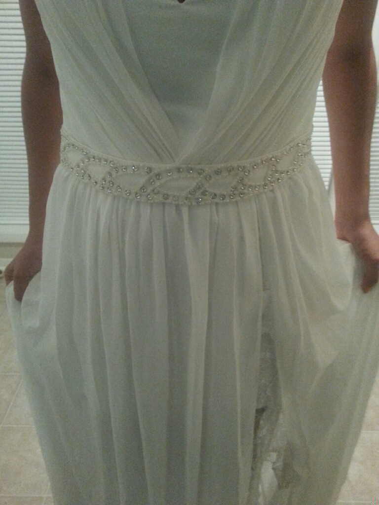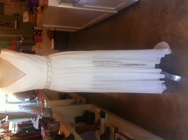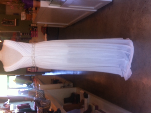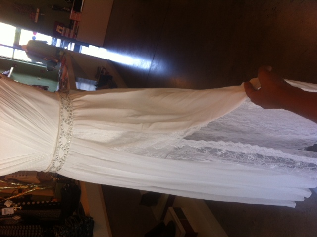 I am selling a wedding dress I ordered just a few months ago. It has never been worn! The reason I am parting with it is because my fiancé and I decided to elope and I opted for a much more casual dress! I paid 300.00 plus 33.00 in shipping or the dress but I can part with it for 200.00 obo. The dress is ivory and has a small train in the back which you can see in the photos. There also is a split in the front that is modest and classy. Its perfect for an outdoor or bohemian bride! Here are the measurements of the dress!