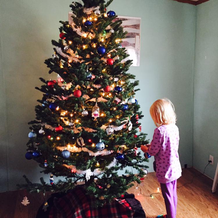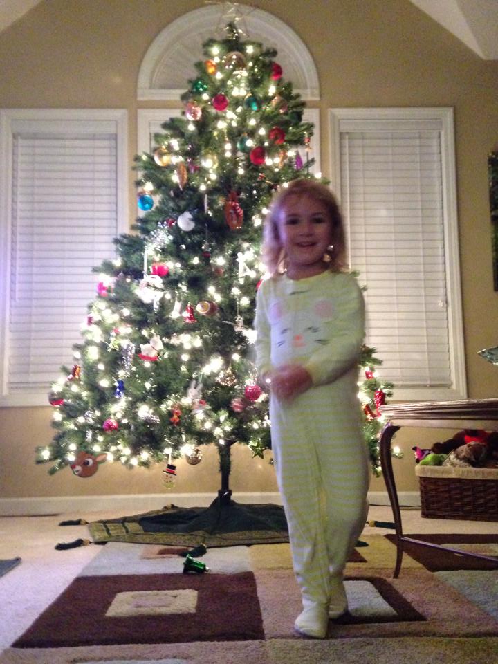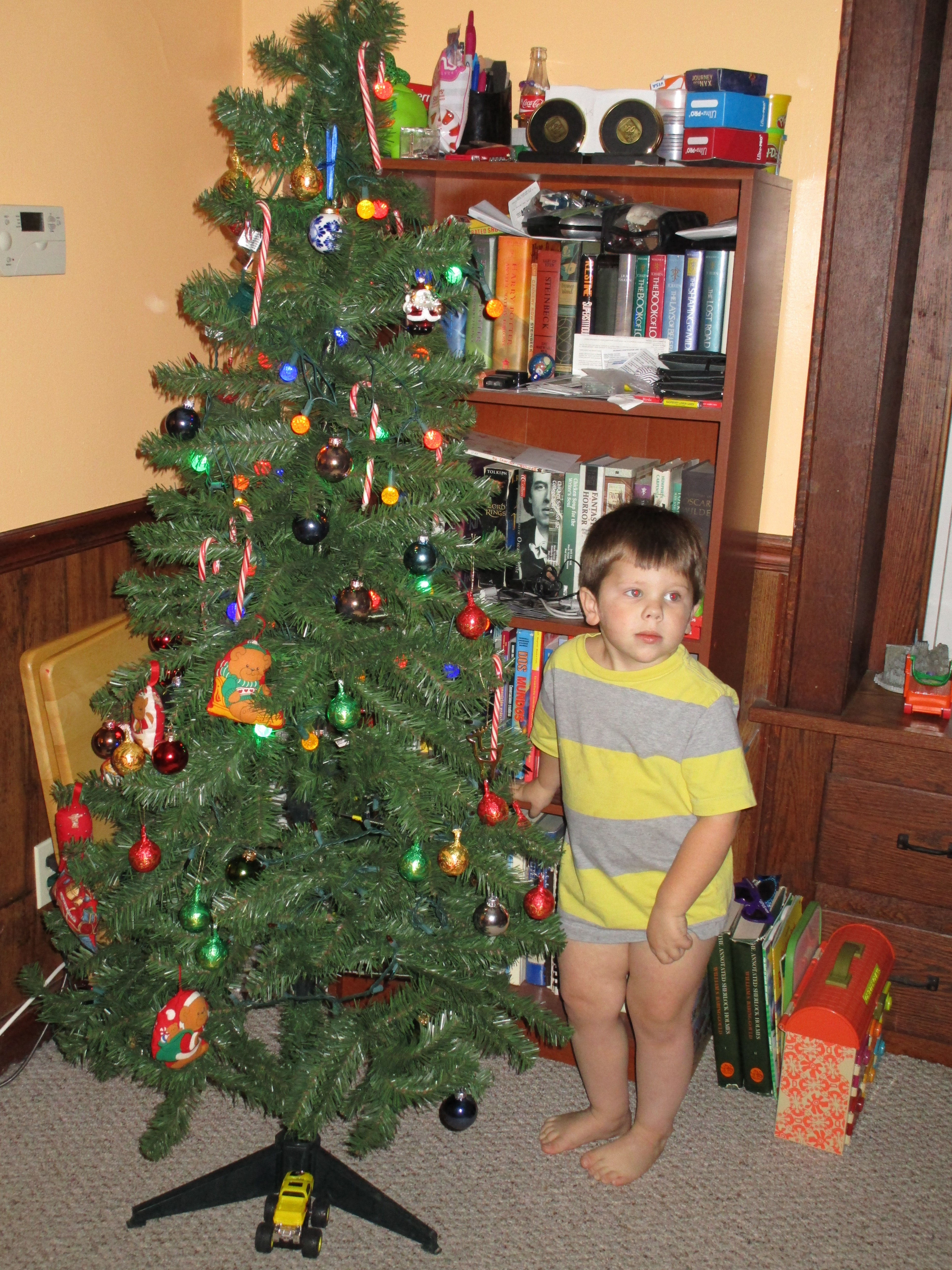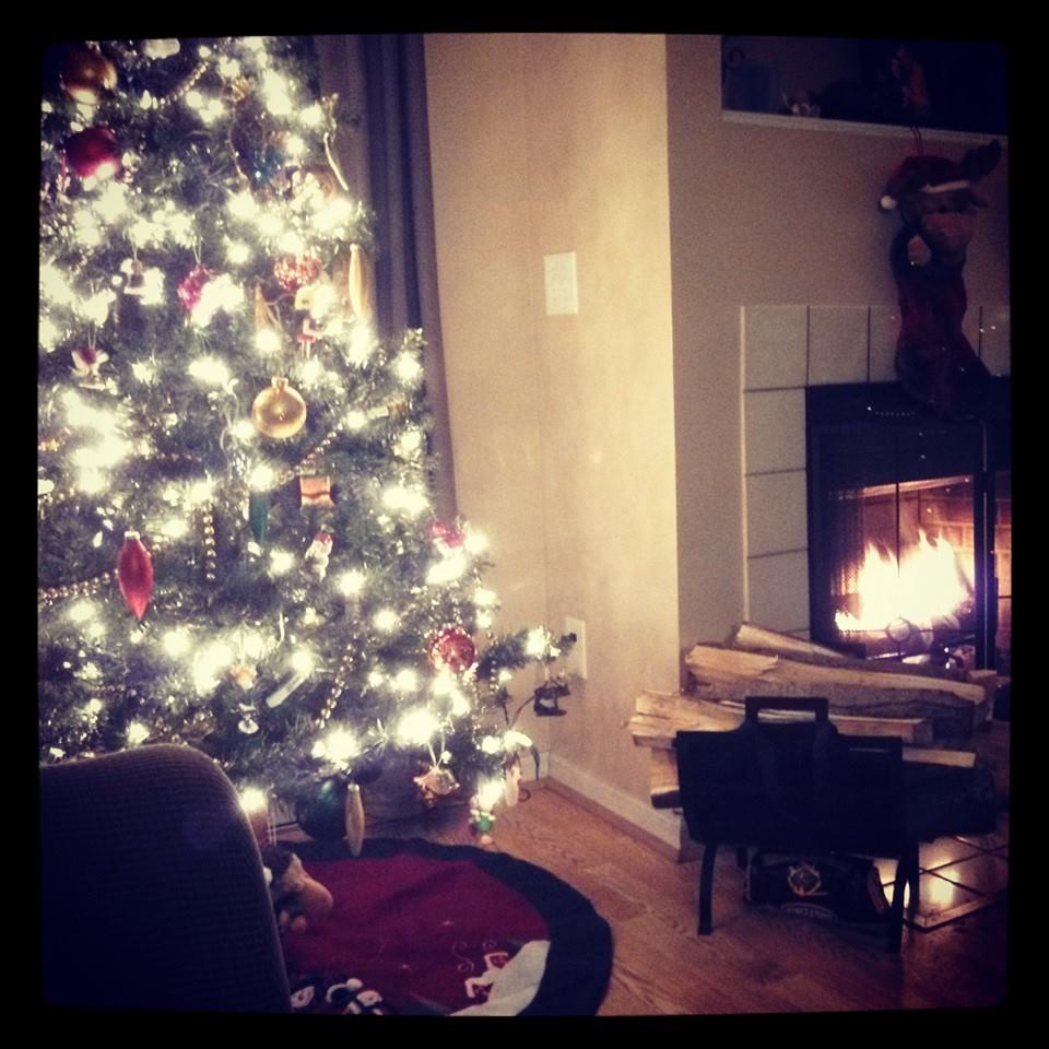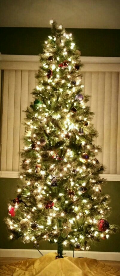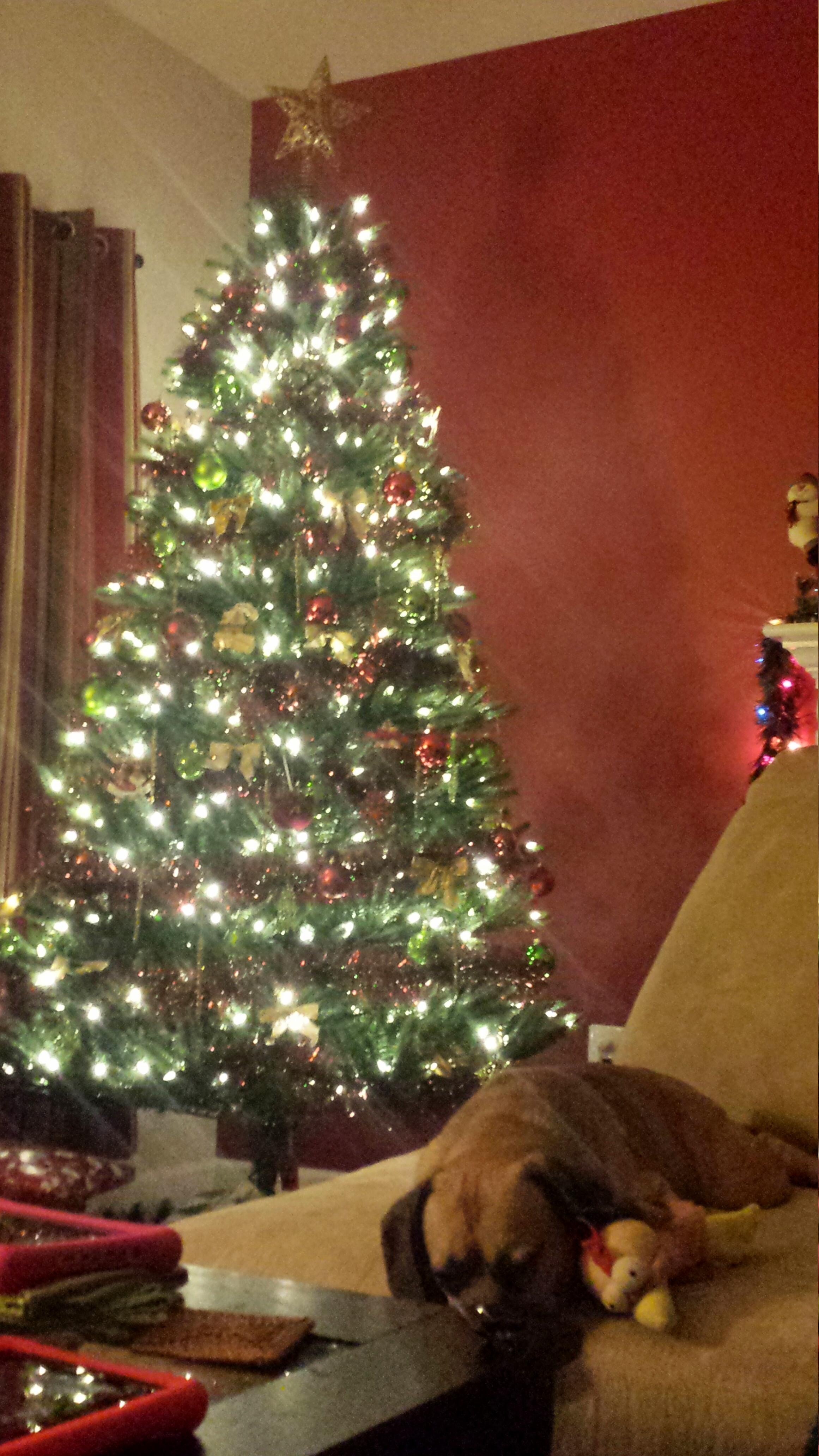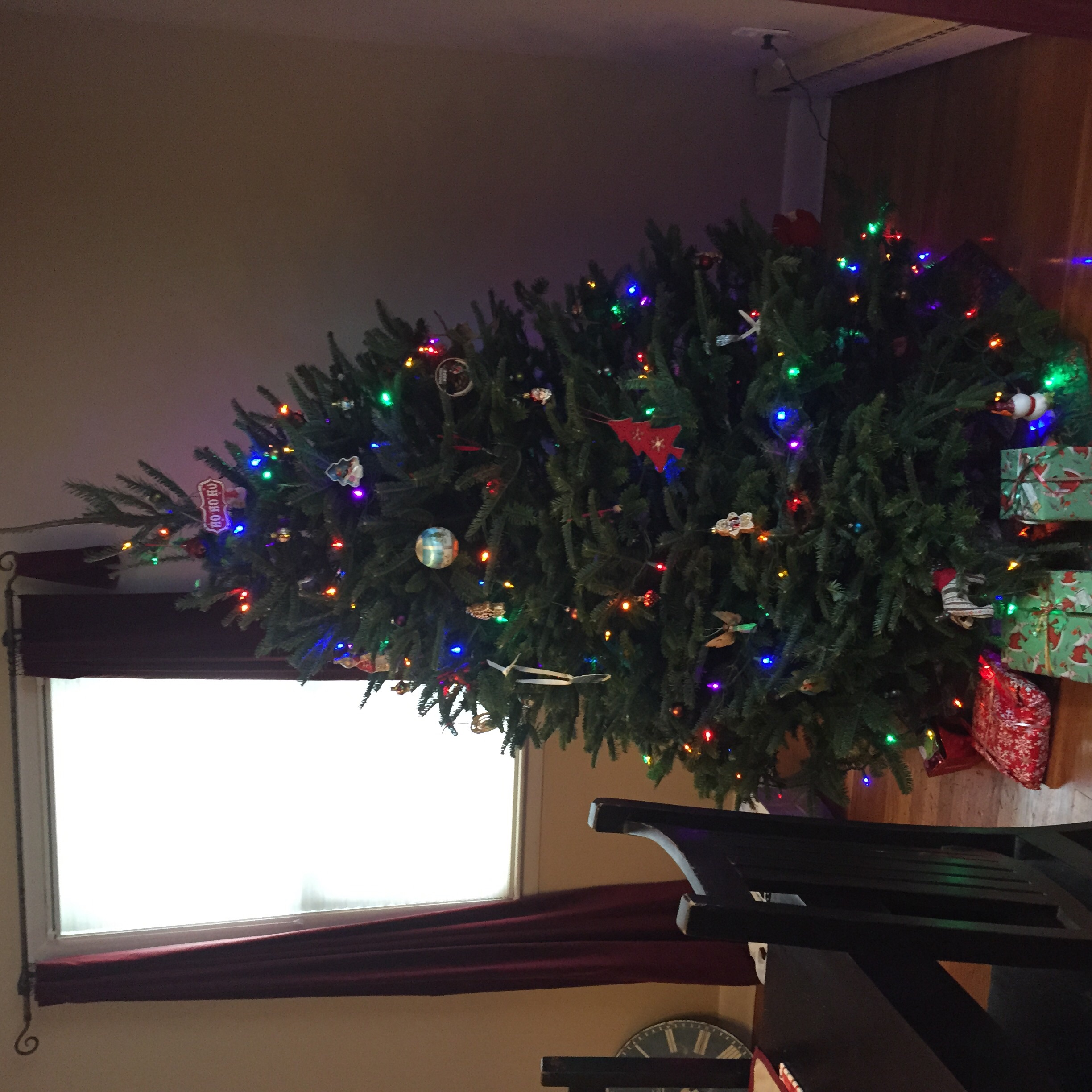 Here's our tree. Real all the way! No topper this year because it has been quite tipsy. We need a better stand for next year.