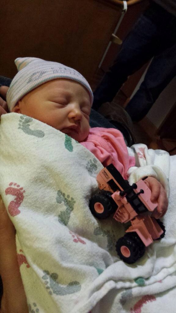 Now for the pictures. My dad already bought her very own pink tractor and had her "playing" with it.
