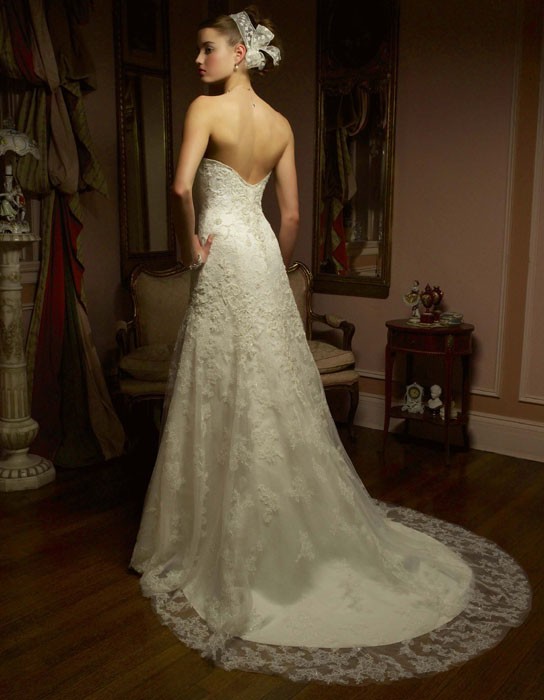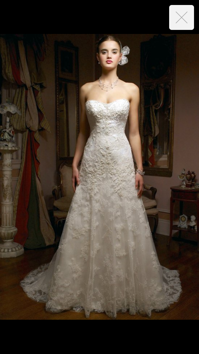 This dress is designed by Casablanca Bridals and features a beaded lace applique over silky satin. It is brand new with tags. The beading and lace detail of this dress are absolutely stunning. Subtle sparkle is infused in the lace throughout the dress, including the chapel length train. Wear it with or without a bridal sash- either way, it is remarkably elegant. The modified sweetheart neckline gives it a soft, romantic feel. This designer also dropped the line of the dress beneath the armpit to eliminate the possibility of skin irritation from the intricate beading. It also has a very low/open back for being a strapless dress- very "in" this year! The weight of this dress is INCREDIBLY light- perfect to avoid being sweaty on your day.