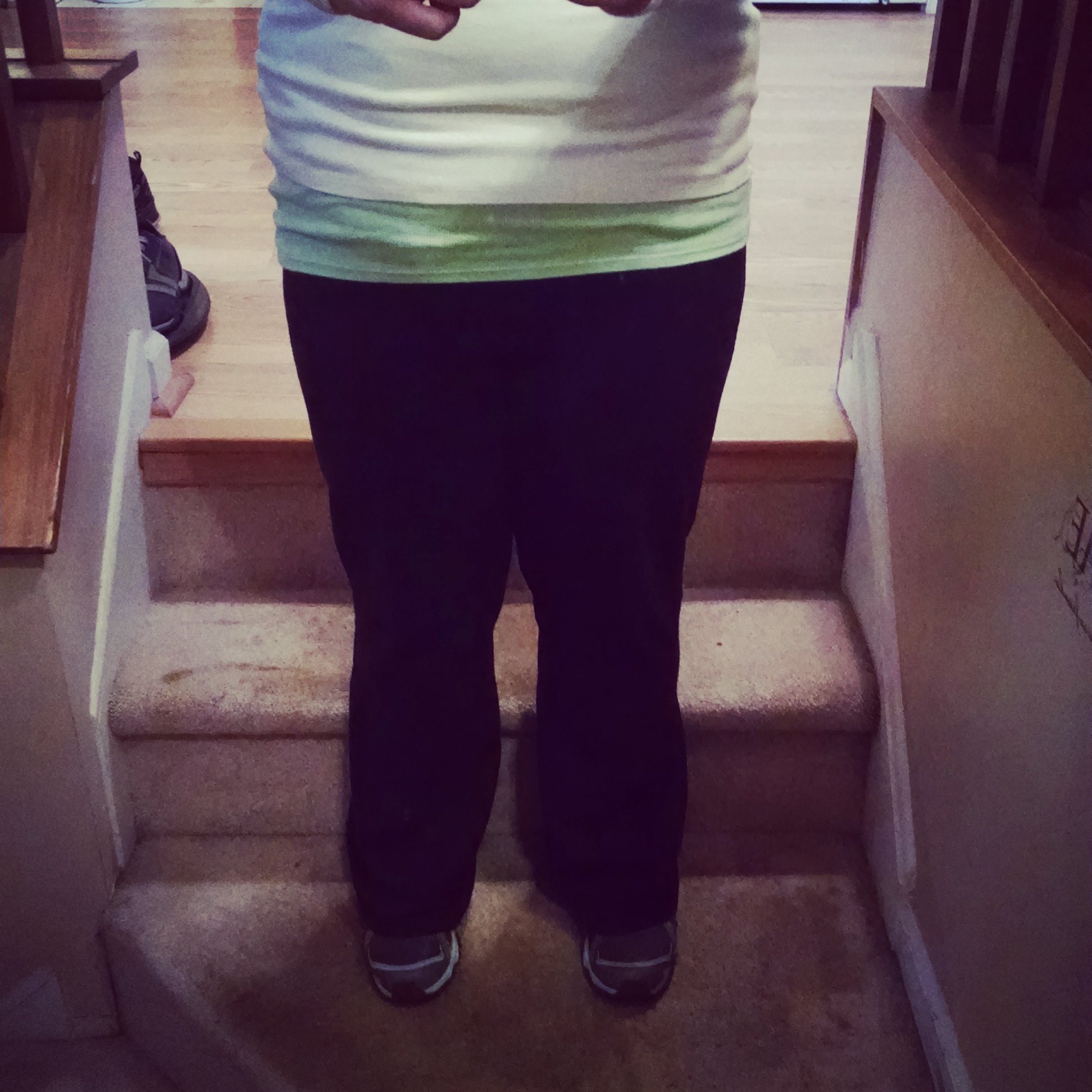 No picture, because I look like a hot mess, but I'm wearing a hot pink polo (Old Navy), a grey cardigan (Costco), Old Navy jean, and tennis shoes.