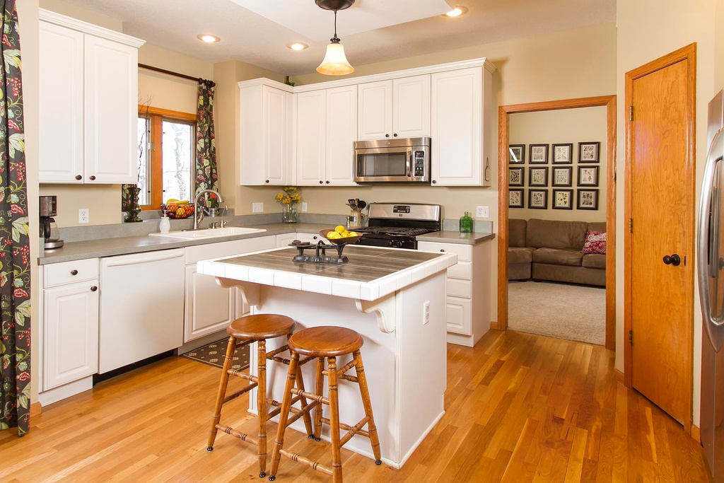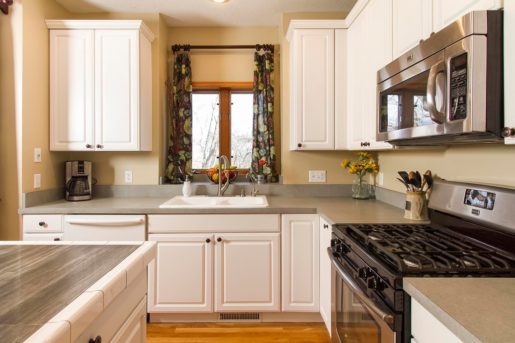Awhile back someone asked me to post pics of my kitchen with the SS appliances we got on Craigslist with our white cabinets. We kept our white DW because it's a Bosch. Sorry, there's no pic of the fridge.