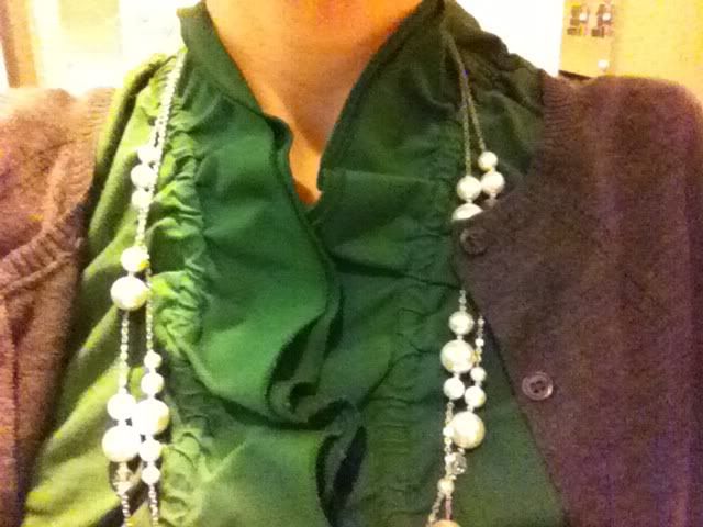 For some reason I'm a day behind in posting outfits- this one is from yesterday. If I can sneak off to the bathroom today I'll get today's outfit. And yup, everything I'm wearing is the Limited. I think I may have a problem. I like the ruffly collar so I'm doing a closeup.
